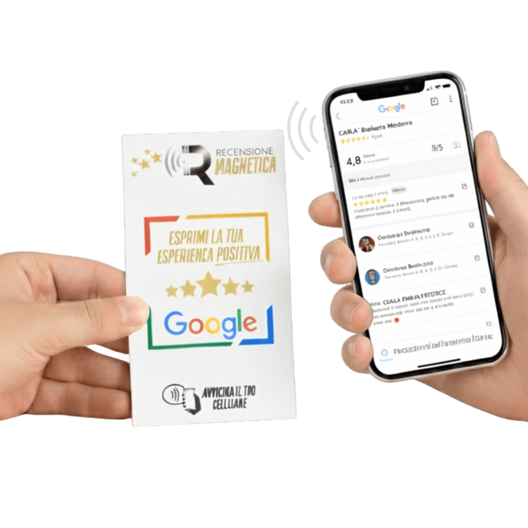 La Card "Recensione Magnetica" utilizza la tecnologia NFC, ed arriva già programmata. Nessun QR code, nessun link complicato.