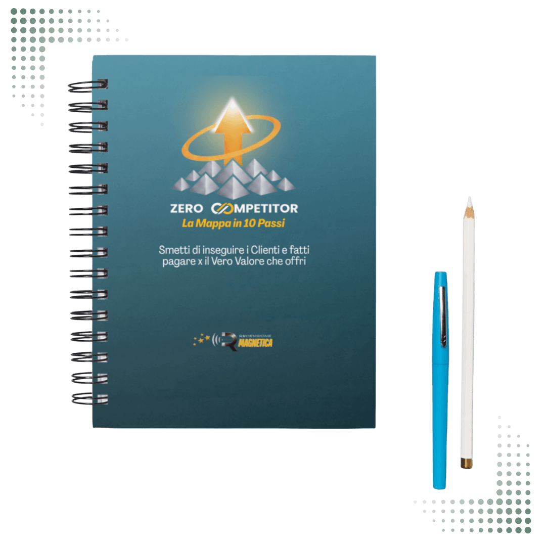 Ricevi lo Schema "Zero Competitor" : La Mappa a 10 Passi per Smettere di Inseguire i Clienti e Farti Pagare il Vero Valore ." è un documento digitale che riceverai tramite mail, contiene tutte le informazioni e le azioni da svolgere per utilizzare la Card "Recensione Magnetica", in modo Strategico,
